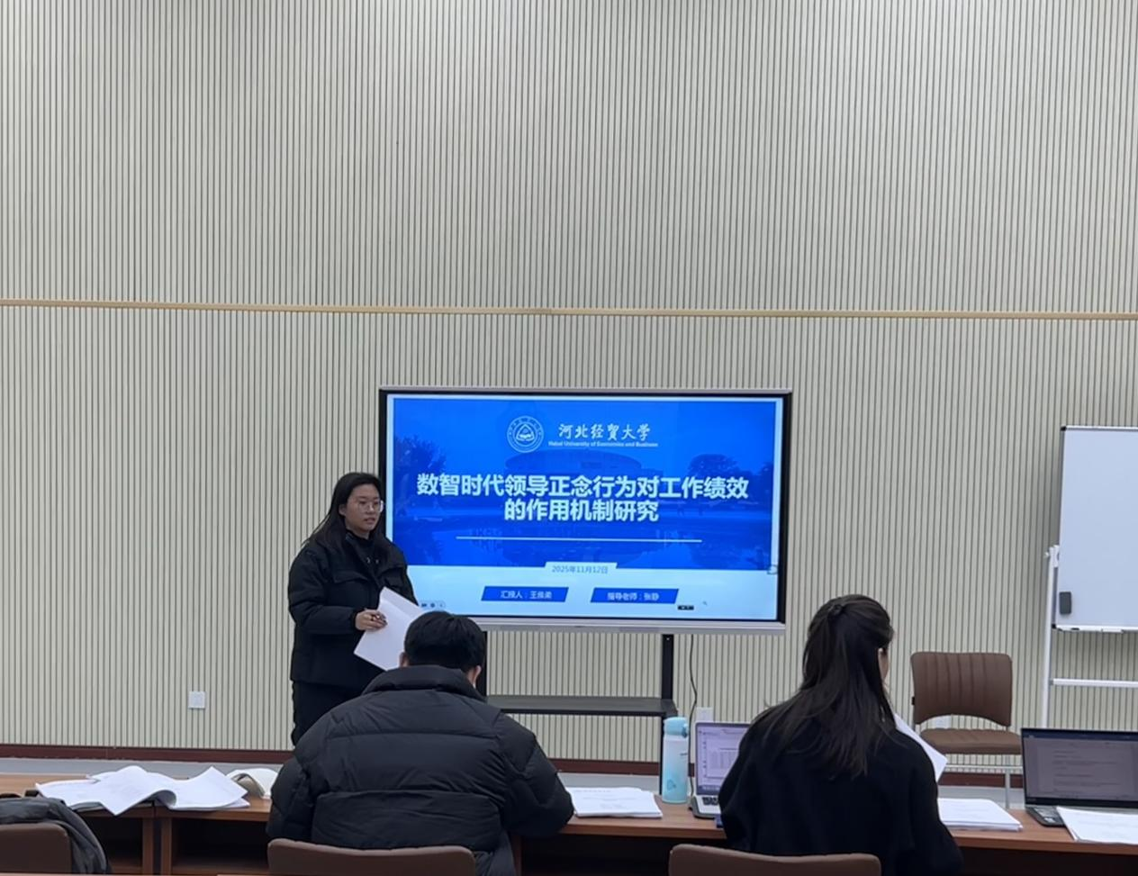 汇报人范雅馨以“领导正念对员工工作行为的影响:底线心态中介与挑战性压力源调节的多变量分析”为题,以中国内地四家企业为研究样本,从现实背景出发,数智化时代员工面临信息过载和任务复杂性,探讨领导正念对员工工作行为的影响,为有效激发企业员工活力提供了理论与实践启示。