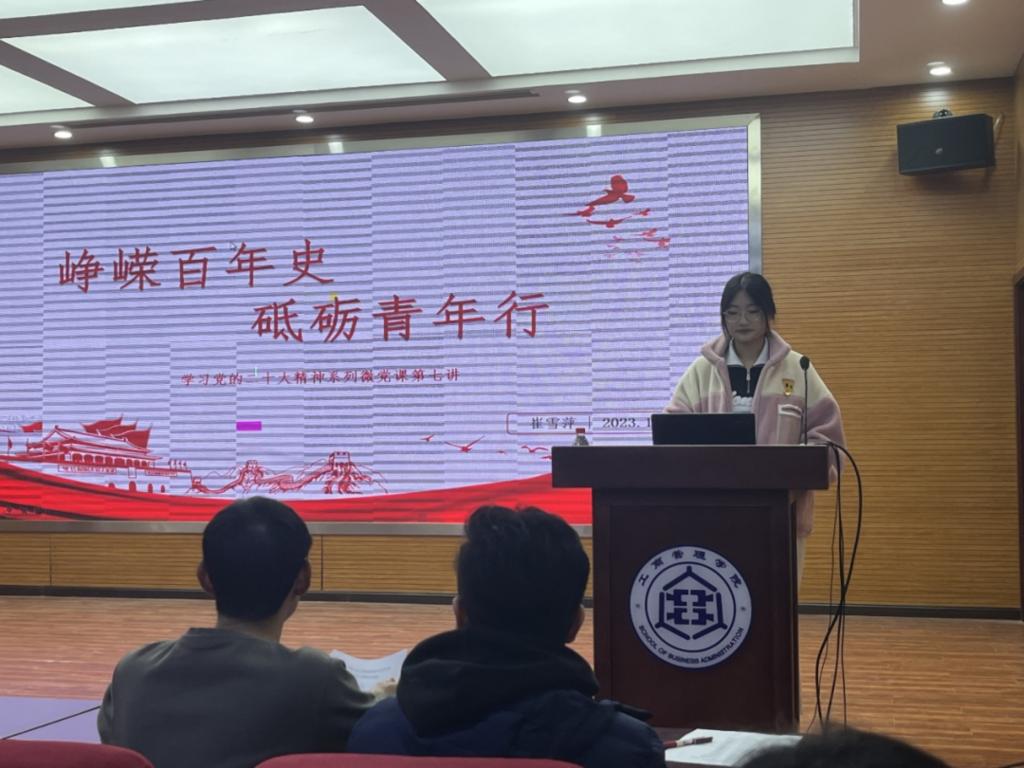2023级工商管理专业研究生崔雪萍主讲本届第七期微党课“峥嵘百年史,砥砺青年行”。通过习近平总书记在庆祝中国共产主义青年团成立100周年大会上的讲话引入本次微党课主题,强调青年在社会中的积极力量,未来属于青年,希望寄予青年。透过电影《山海情》《觉醒年代》,强调青年要将个人命运与国家命运紧密结合起来。青年之要义于在心境,而不只是年龄;青年之先决在于觉醒,而不只是奋斗。最后,通过介绍先辈的辉煌经历引出普通人也应当努力奋斗,坚持在平凡与不凡的辩证下砥砺前行。
