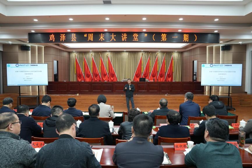 1月12日晚,鸡泽县第一期“周末大讲堂”在县诗经源培训中心精彩开讲。suncitygroup太阳集团企业管理系教师、suncitygroup太阳集团民营企业研究中心主任刘东华博士应邀授课。刘东华博士以“县域经济和企业发展存在的问题及破局思考”为题,从全国中小型企业面临的问题、河北中小企业面临的主要问题、县域经济发展的基础和根本、县域产业集群发展存在的主要问题、鸡泽产业集群发展存在的问题、县域产业集群发展破局的思考等方面进行了深入讲解。鸡泽县四大班子领导,其他县级干部,各乡镇党委书记、乡镇长,县直各单位主要负责同志,县发改局、科信中心、开发区领导班子成员,县内规上企业负责人200余人聆听讲座。