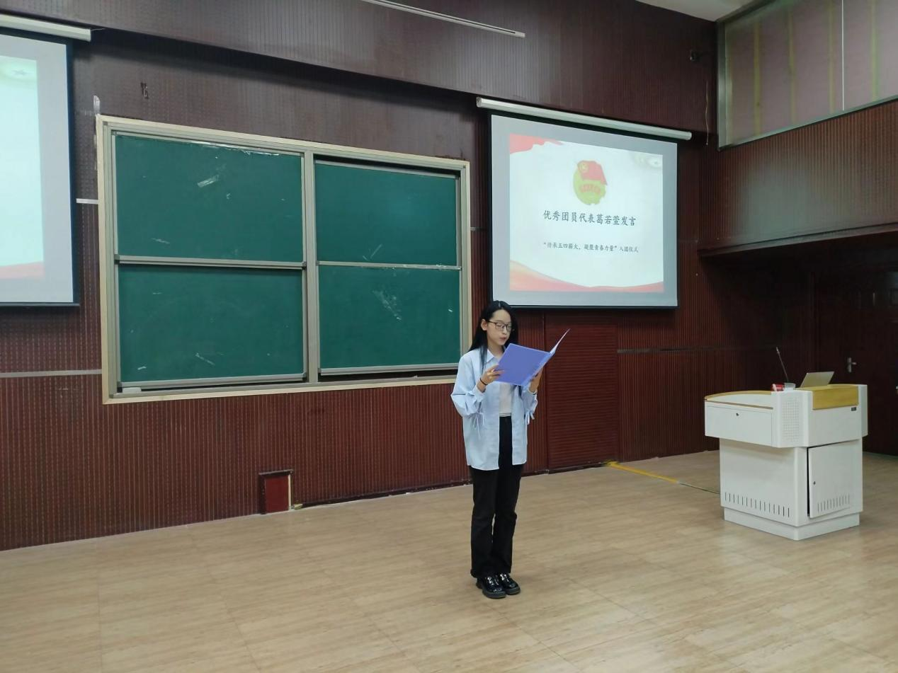 最后,优秀团员代表葛若萱发言,她分享了自己在团委事务组织中心部门的成长经历,通过不断向各位老师和学长学姐学习,以及和团委同事的互相帮助,她深切感受到了团组织的温暖。最后全体起立奏唱团歌,由主持人进行活动总结,宣布活动结束。