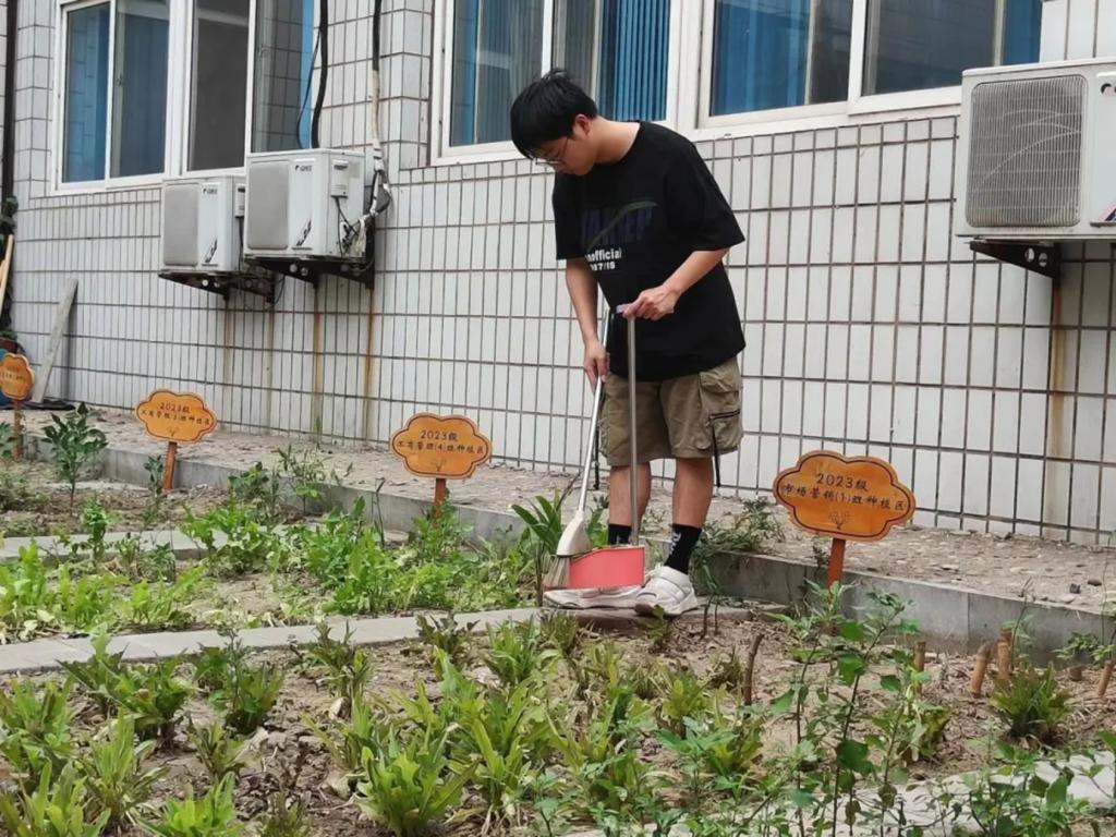 同学们定期会来到劳动教育实践基地,细心地观察着蔬菜的生长情况,确保每一棵幼苗都能得到充足的水分。他们有的蹲下身子,用手轻轻地将杂草连根拔起,助力蔬菜的成长;有的清扫种植园内外的垃圾和杂物,维护种植园的干净和整洁。阳光洒在他们的脸上,映照着他们专注而充满期待的神情,仿佛在为这片充满生机的土地绘制一幅动人的画卷。