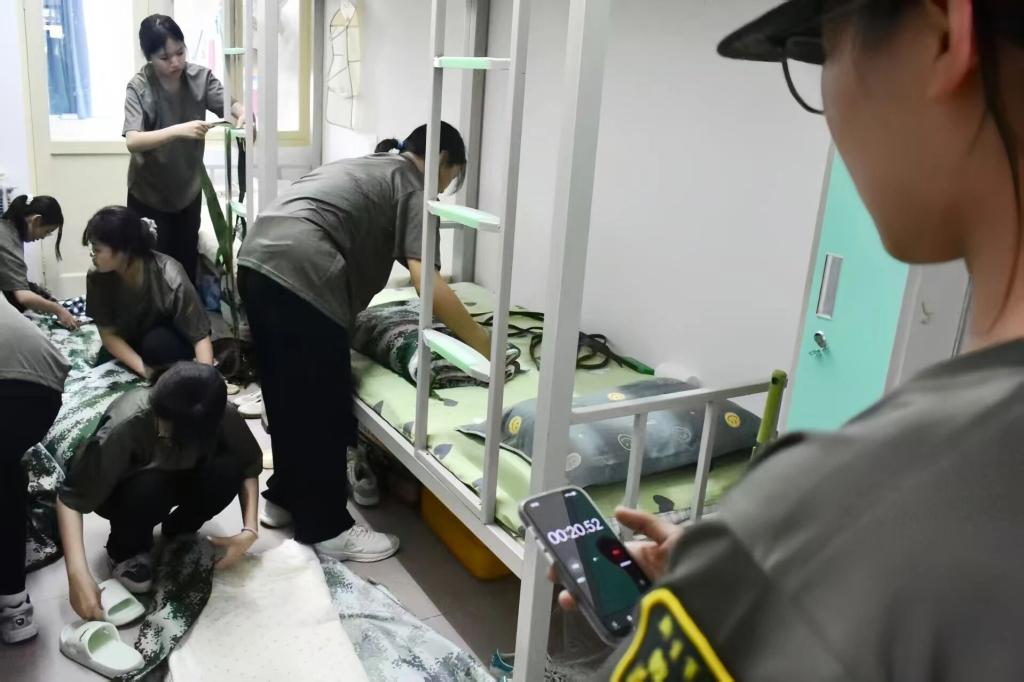 同学们严格遵照军训叠被标准,各自在床前站定就绪。随着教官一声令下,叠被团体赛正式开始,大家立刻投入状态,争分夺秒地铺平被面、压实边角、叠出规整形状。每个人都专注于自己的动作,手指快速整理被角,眼神紧盯叠被线条,全力朝着“又快又好”的目标冲刺。