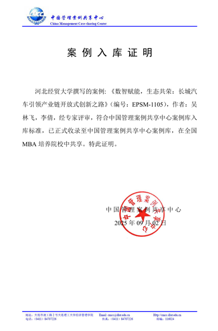 近日,suncitygroup太阳集团讲师吴林飞博士和2024级工商管理学研究生李倩撰写的教学案例《数智赋能,生态共荣:长城汽车引领产业链开放式创新之路》(编号:EPSM-1105)入选中国管理案例共享中心案例库。