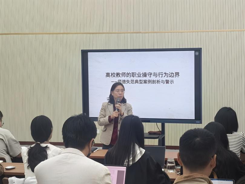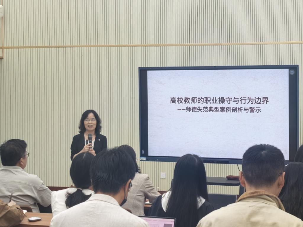 田教授围绕高校教师的职业使命与操守要求,从学术诚信、师生关系、公共言论、职业行为等多个维度深入分析了近年来高校中发生的师德失范典型案例,以此强化教师底线思维,明晰教学科研中的行为准则。她指出,高校教师不仅是知识的传播者,更是员工品格养成的重要引导者,必须时刻以《新时代高校教师职业行为十项准则》为镜,坚守职业底线,明确行为边界。随后,田韶华教授结合实际案例就日常教学科研中如何防范师德风险、处理师生关系等问题进行了阐述,她强调,教师应自觉接受监督,强化责任意识,严格以高校教师“五维道德准则”,即坚守为人品德、恪守业务道德、践行育人道德、严守学术道德、遵守公共道德自我约束,切实做到以德立身、以德立学、以德施教。