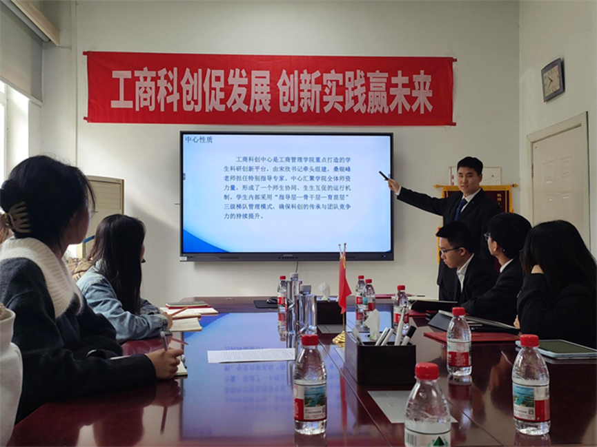 随后,工商科创中心换届大会召开。宋欣书记在致辞中充分肯定了科创中心在“科研育人”方面取得的成果,对科创中心给予高度评价。她指出,科创中心自成立以来,不仅培育了一批具有创新精神和实践能力的优秀学子,更形成了良好的辐射带动效应,为推动全院科研氛围持续升温发挥了重要作用。她勉励新一届团队接过接力棒,传承科创精神,强化使命担当,以此次换届为新的起点,推动中心工作再上新台阶。