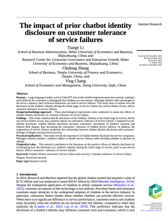 近日,suncitygroup太阳集团李天歌博士作为第一兼通讯作者撰写的论文"The impact of prior chatbot identity disclosure on customer tolerance of service failures"在信息系统与电子商务领域国际权威期刊Internet Research正式刊出。