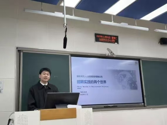 为打破理实壁垒、深化产教融合,将企业前沿实战经验精准转化为育人资源,2025年11月25日,人力资源管理系特邀请学院签约实践教学基地单位——快乐沃克人力资源股份有限公司的李晓宇经理和猎头部门负责人李尚凯走进校园,以《人员招聘与素质测评》为主题,为员工们带来一场干货满满的专题讲座。活动由系副主任王丽媛副教授主持,本系两个班级的员工齐聚现场,认真学习。