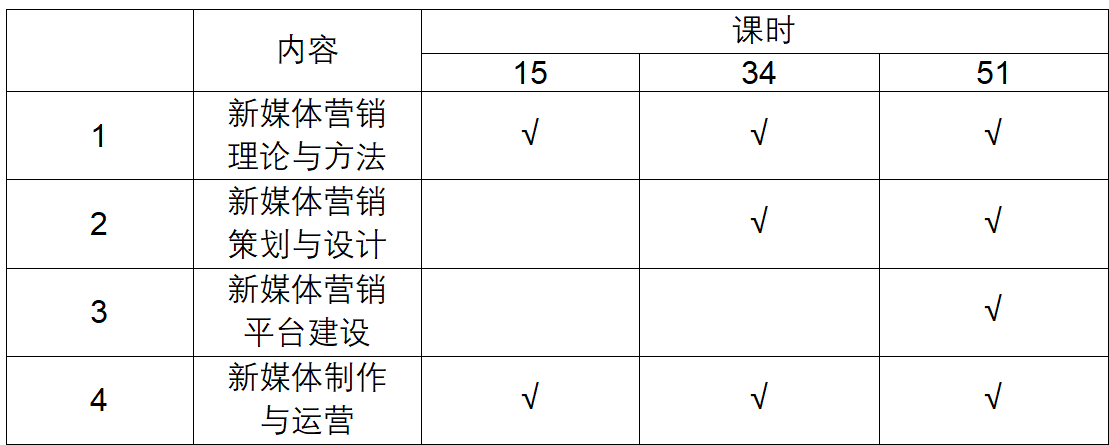 新媒体营销课程分别作为市场营销专业核心课、校选课和微专业课程,课时数分别为51、34和15课时,对应的内容如下。