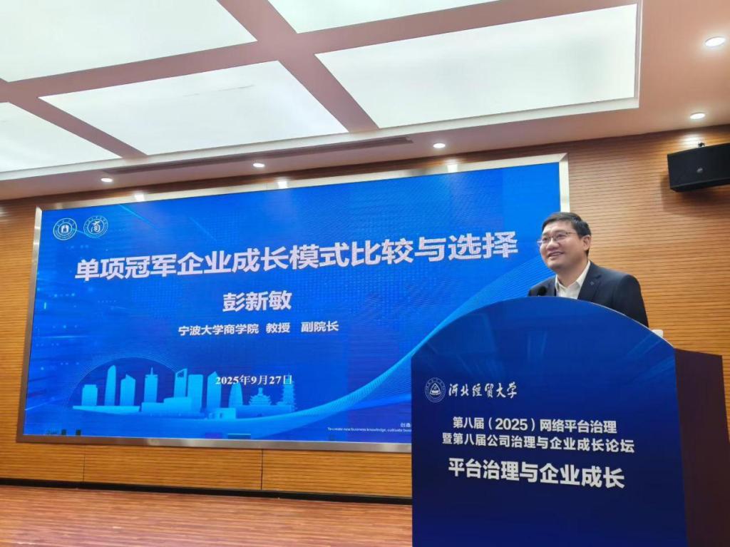 宁波大学商学院副经理彭新敏教授作题为“单项冠军企业成长模式比较与选择”的主题报告。他从中国制造业规模全球第一的宏观背景与宁波“单项冠军之城”的实践切入,深入剖析了单项冠军企业在创新与效率之间面临的战略悖论,提出创新引领型、效率赋能型与双轮驱动型三种典型成长模式,并基于技术机会、知识复杂性等维度,对永新光学、激智科技、海天塑机三家冠军企业进行了系统比较。该研究构建了“行业技术体制—企业成长模式”的创新分析框架,揭示了企业依托自身技术基础选择成长路径的内在逻辑,为专精特新企业突破成长瓶颈提供了理论指引与实践参考。