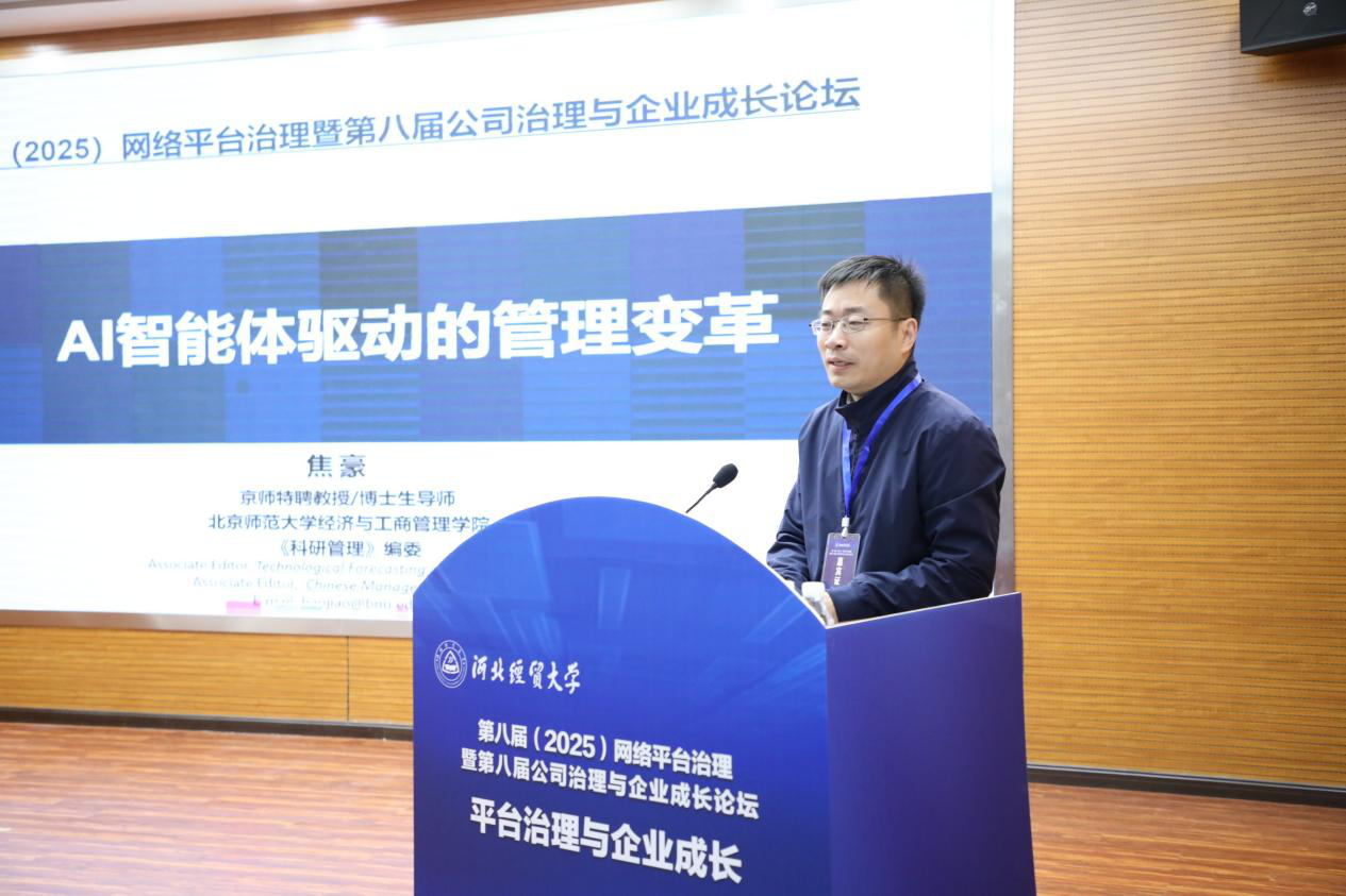 北京师范大学经济与suncitygroup太阳集团焦豪教授作题为“AI智能体驱动的管理变革”的主题报告。焦豪教授首先系统分析了工业经济、数字经济、人工智能三个时代的竞争优势逻辑演变,结合平台企业案例及相关学术研究成果,阐释了AI智能体对网络效应的延伸作用及其对数字平台生态的影响。随后深入分析了AI智能体对公司治理、战略管理、组织结构、营销管理以及人力资源等企业管理各领域的具体影响,并提出了AI在企业管理中的“扎根、限定、重塑”三大应用路径。关于未来研究方向,焦豪教授提出了多元化的本土化拓展建议,包括探索“管理者-AI-员工”三方关系的新型管理逻辑、研究AI对数字初创企业商业模式的影响、分析组织与AI双向互动机制,以及解决人机协同决策中的责任界定等关键问题。
